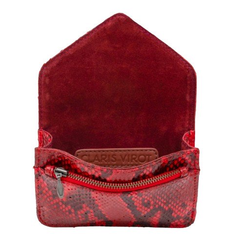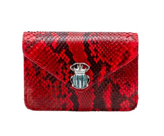 Petite pochette en python RUBIS avec son petit scarabée en laiton ARGENT TURQUOISE. Deux compartiments à l'interieur, dont un avec un petit zip pour mettre la monnaie.