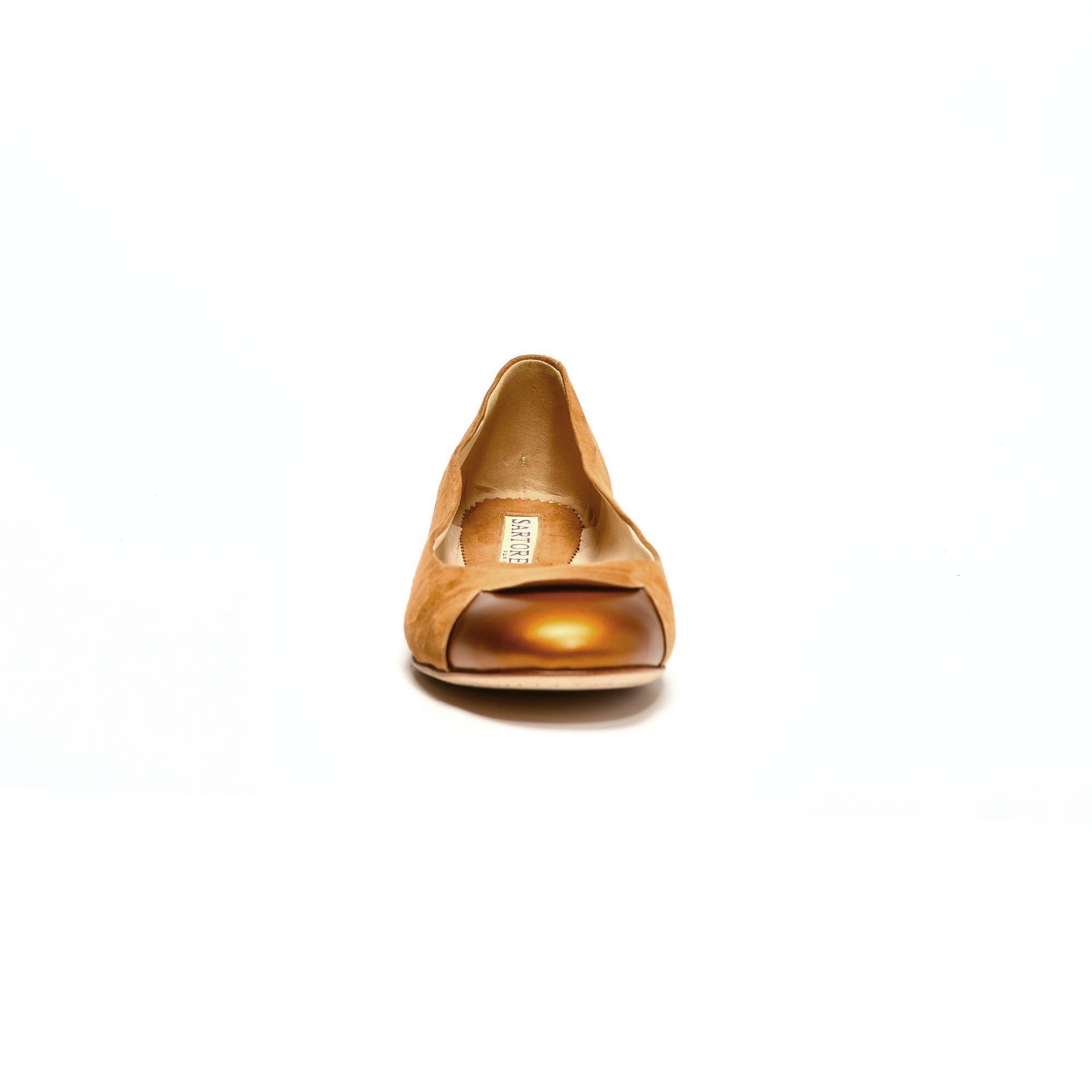 Pour cette saison printemps-été, optez pour les ballerines en veau velours cognac avec le bout rond en cuir cuivré 3300 Sartore.