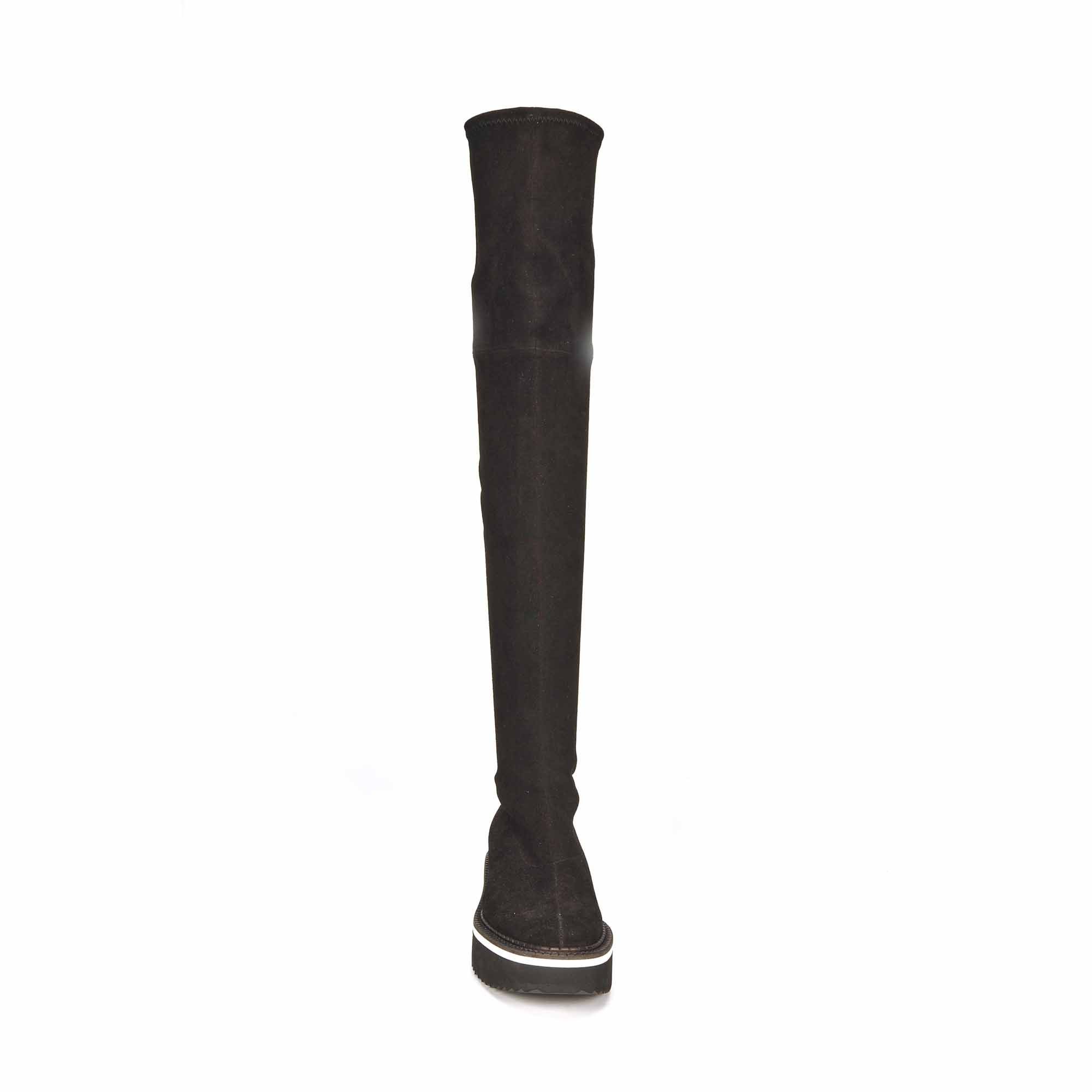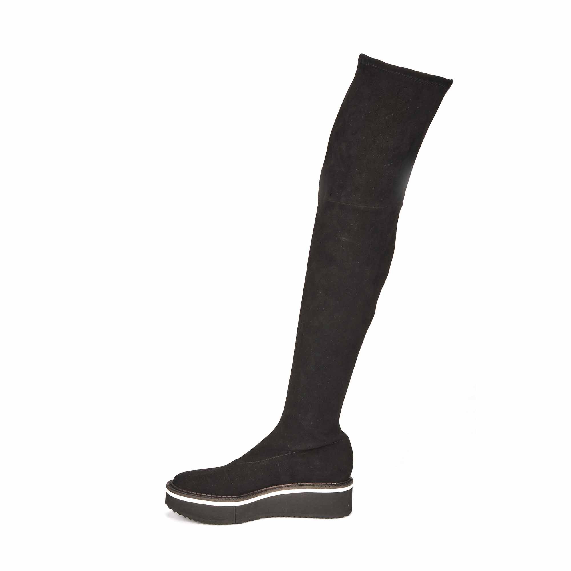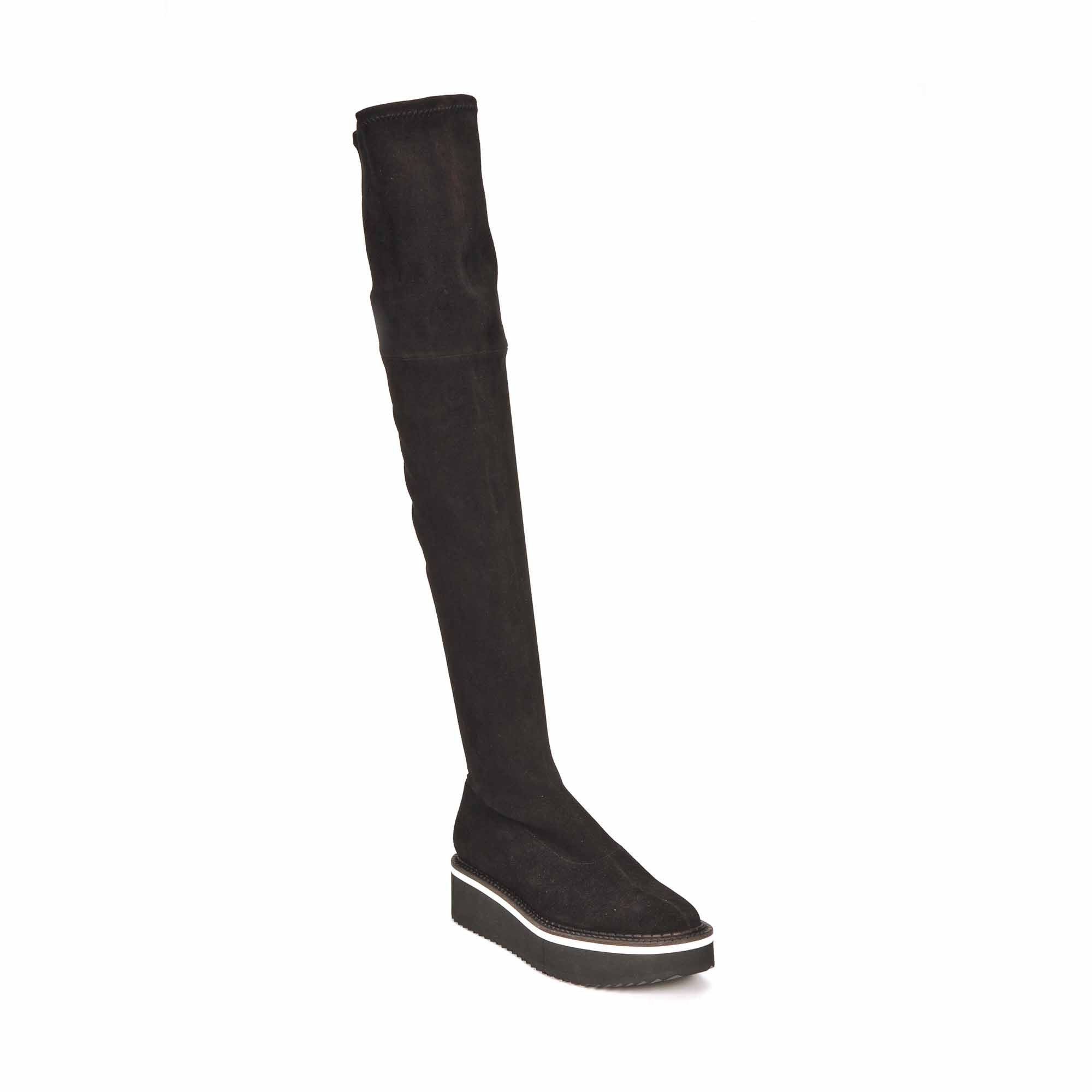 Clergerie vous présente pour l'Hiver 2019/20 la cuissarde agneau strech, en cuir velours noir. La plateforme articulée bicolore noir/blanc ultra-légère donne un confort exceptionnel.