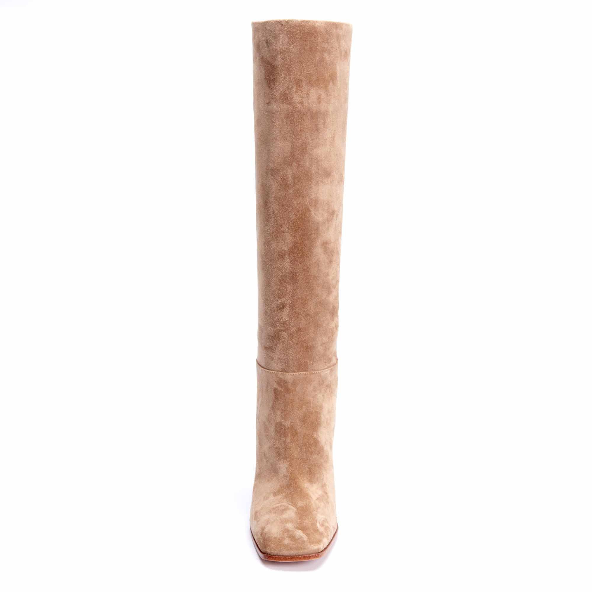 La nouvelle botte GIANVITO ROSSI en SUEDE BISQUE apport de l'élégance à toutes vos tenues. Son large talon de 8,5 cm de hauteur et son bout légèrement carré assure un véritable confort.