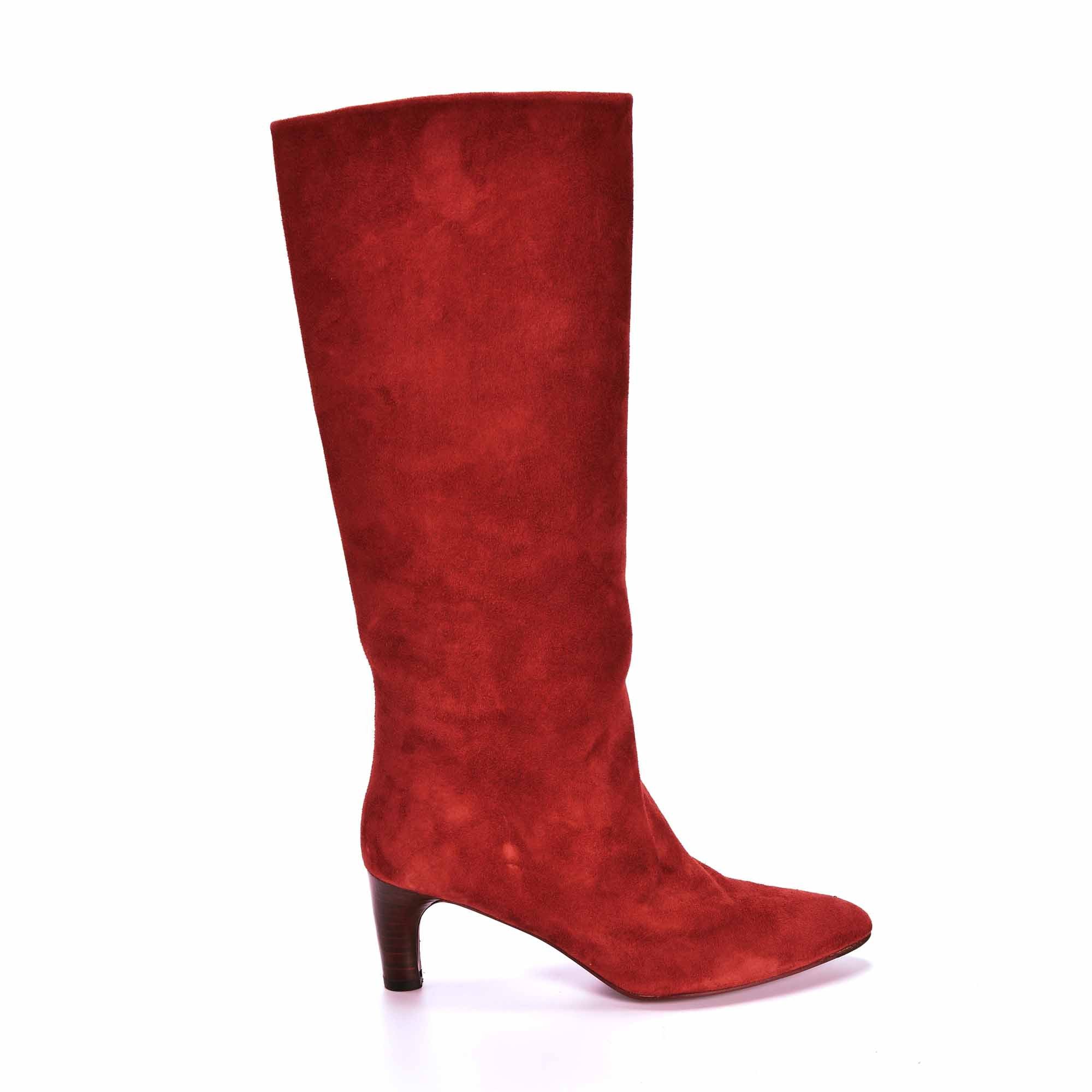 Le modèle INUIT est une botte d'une seule partie en cuir de chevre velours cuivre sur un talon bottier de 6 cm.
