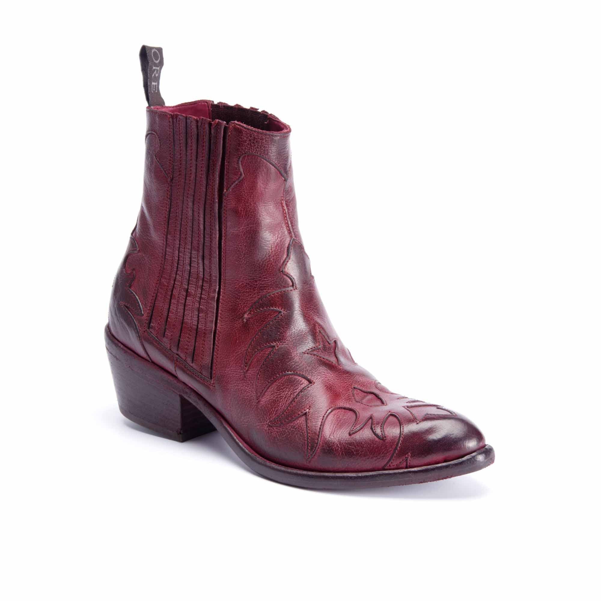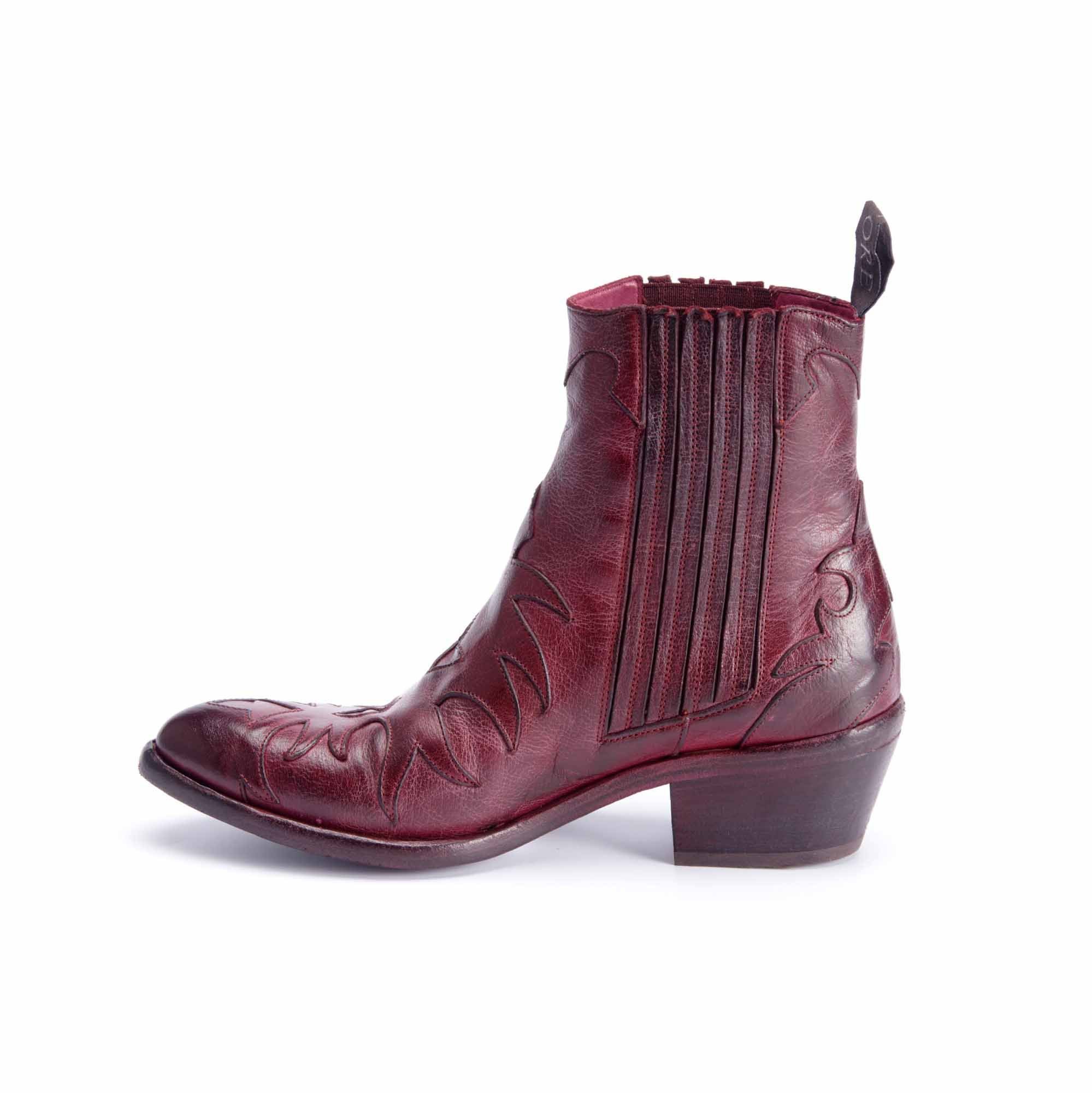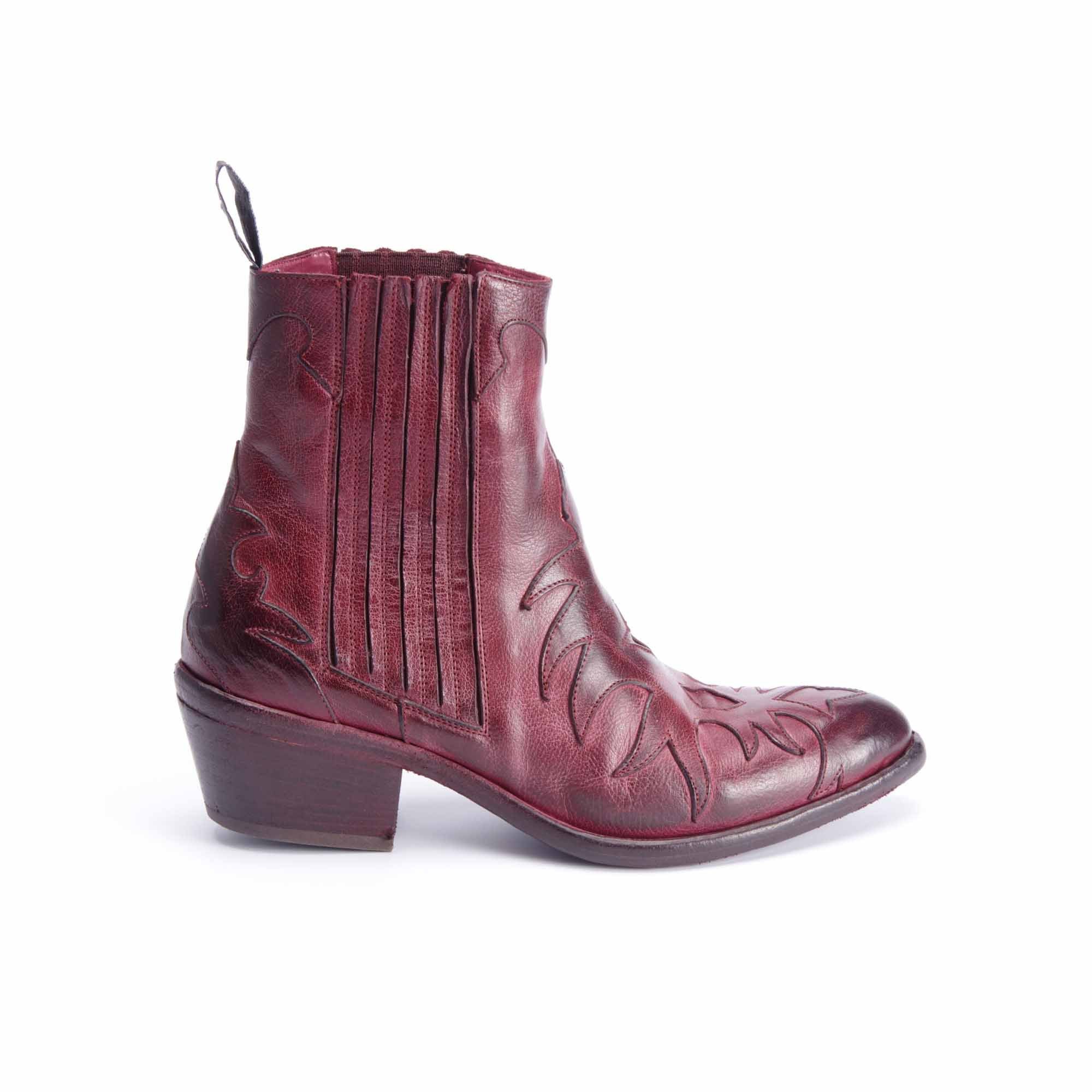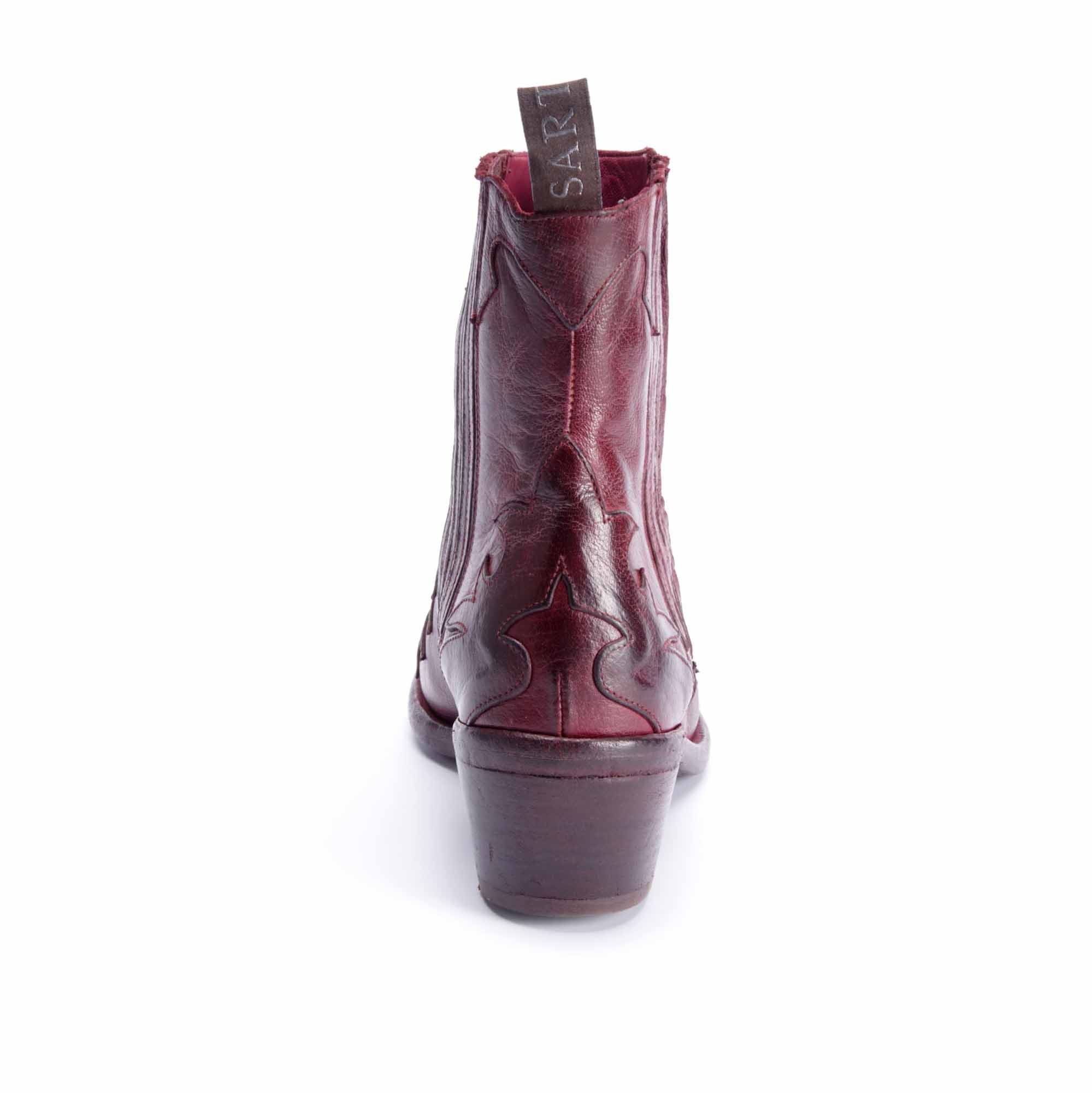 Boots western flamme SR 3720 Sartore iconique en veau lavé prune. Ces jolis contrastes sont accompagnés de découpes flamme. Le talon biseauté de 4,5 cm et ses élastiques latéraux assurent un véritable confort