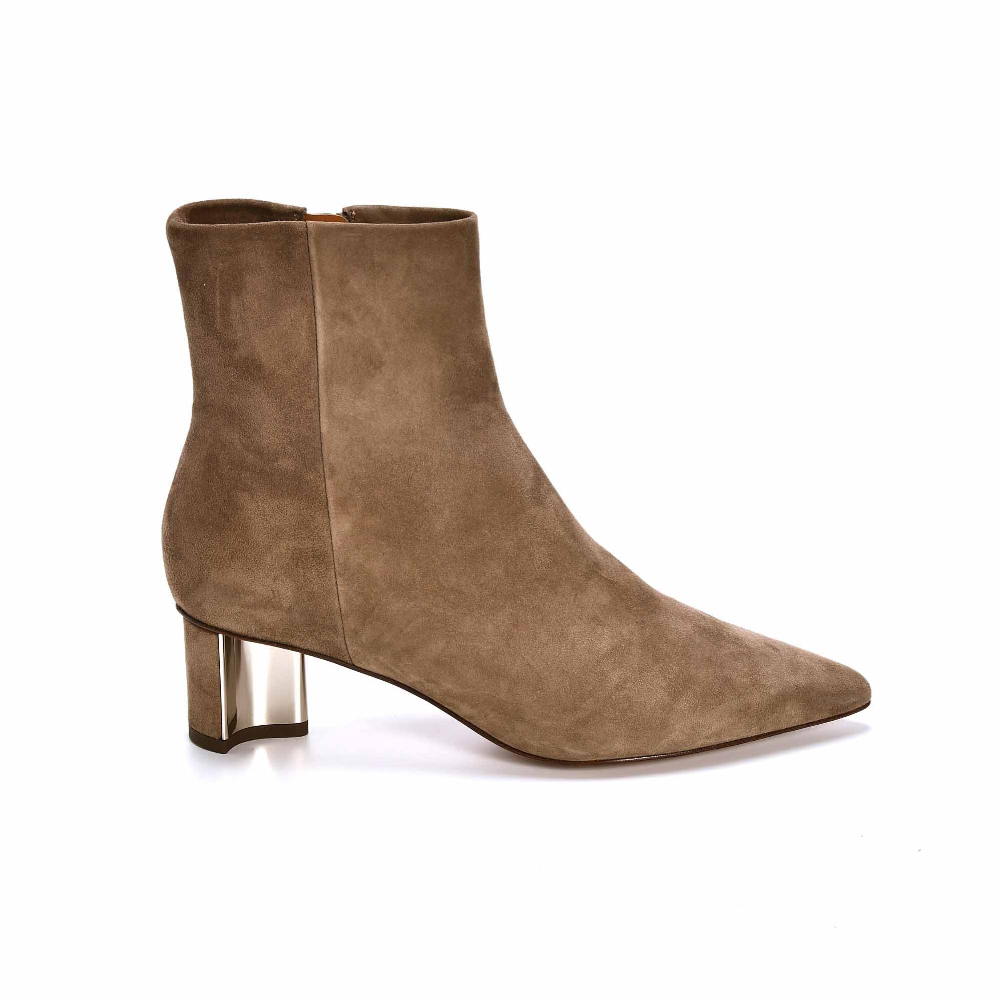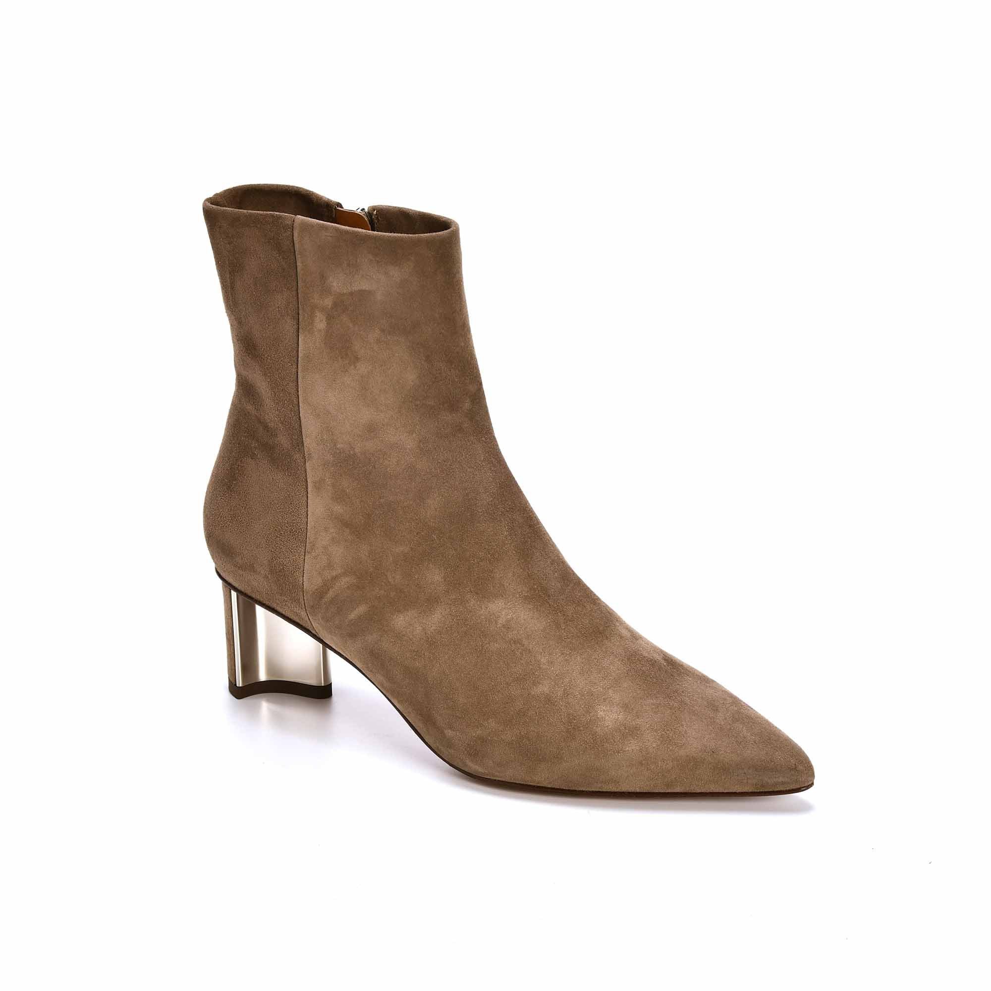 Elégance et délicatesse sont associées avec les boots pointues SECRET en chèvre velours beige CLERGERIE. Le talon en métal fin de 5 cm est le détail chic de la chaussure, idéale pour la parisienne qui arpente les rues.