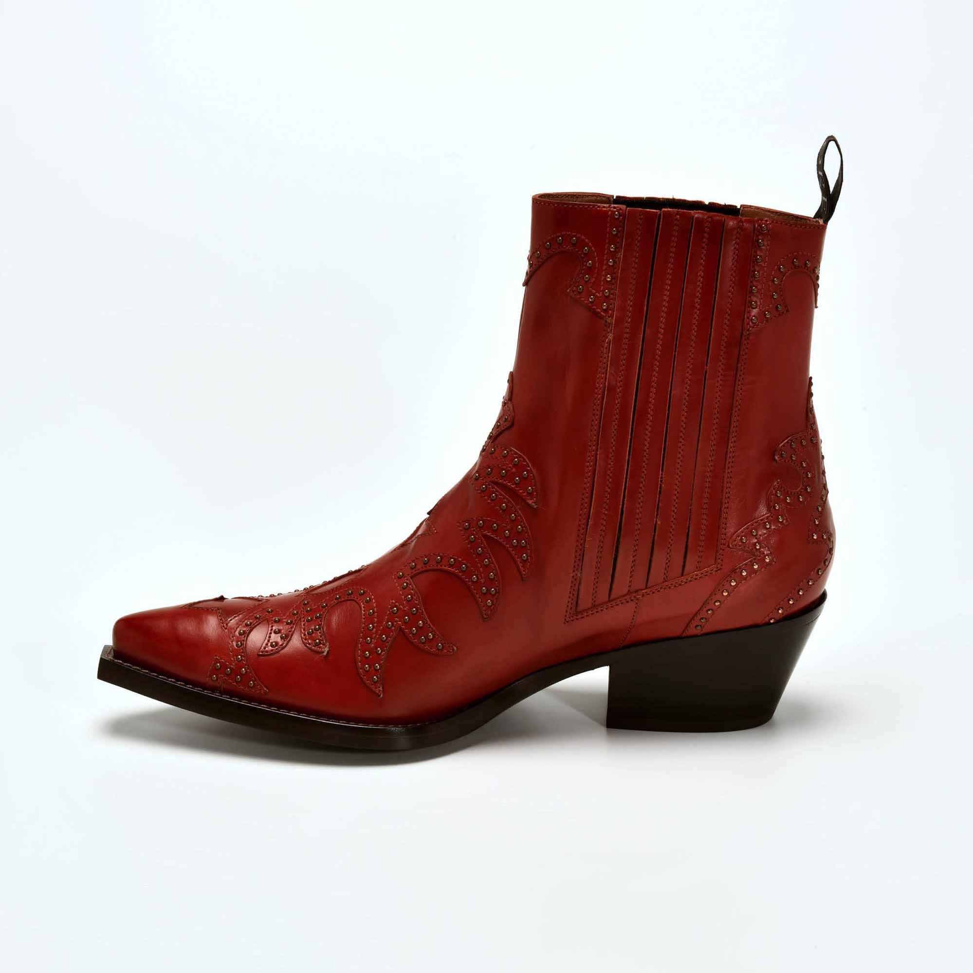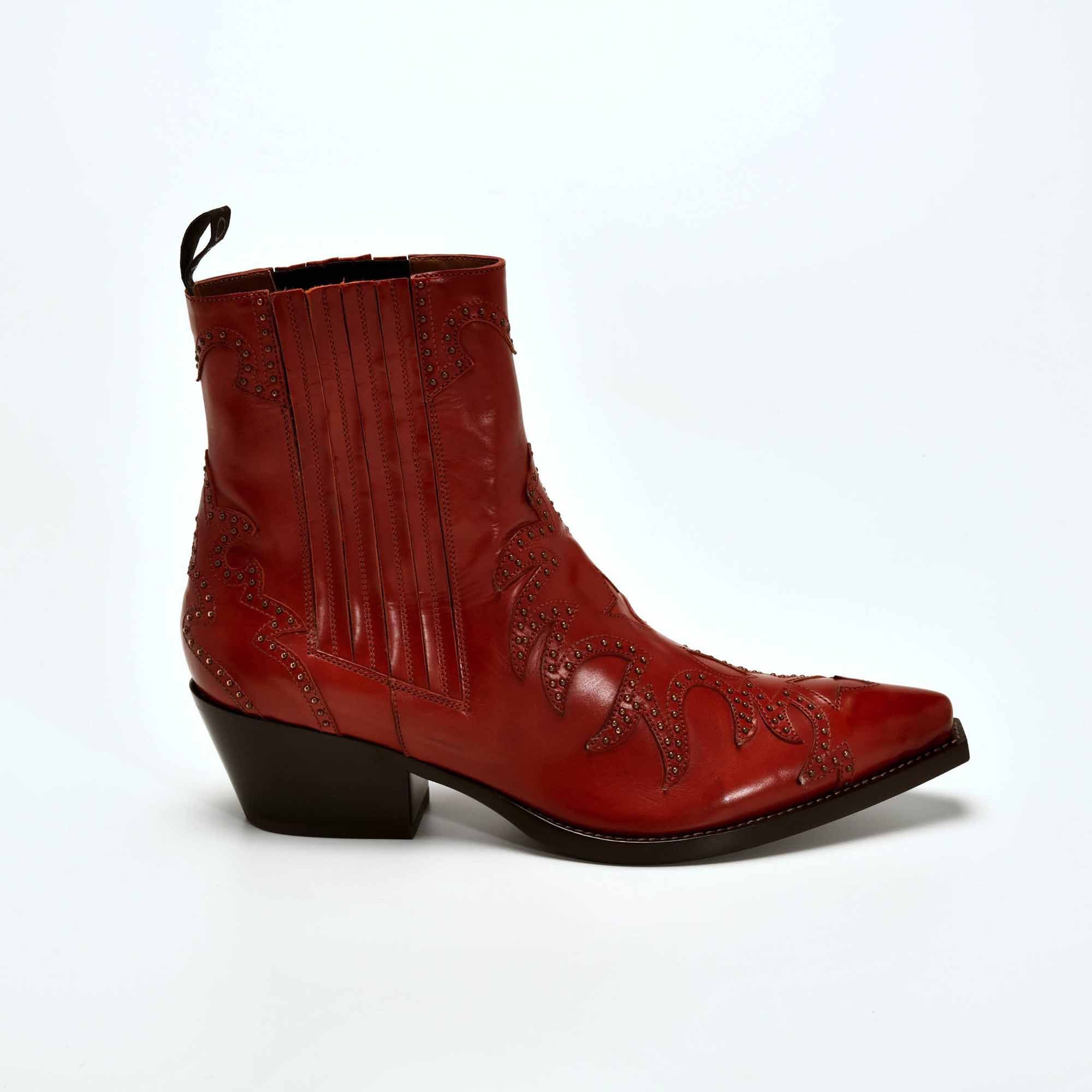 Boots western iconique cuir carmine agrementé de clous bronze qui donne un aspect rock. Il est orné d’une découpe flamme. Le talon biseauté de 4,5 cm et ses élastiques latéraux assurent un véritable confort