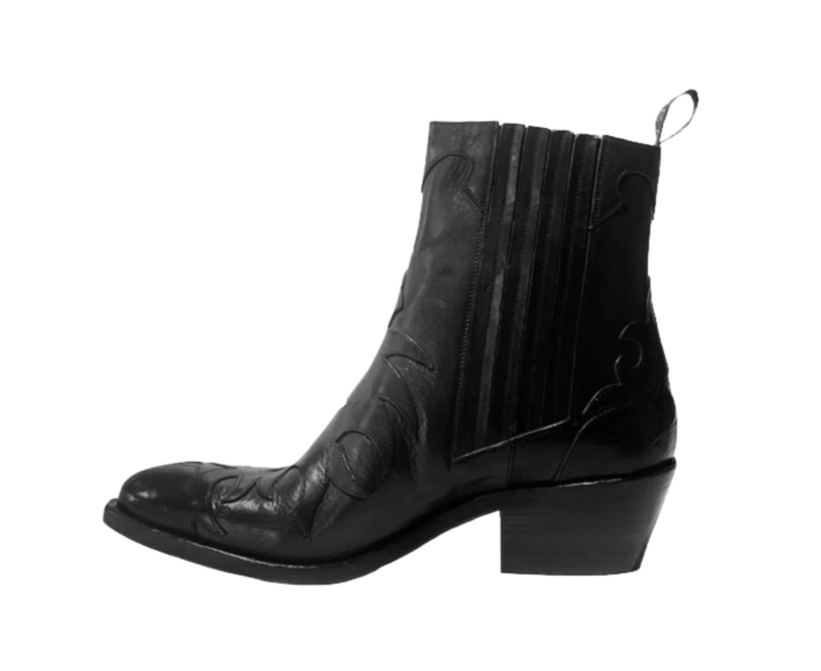 Boots western flammes Sartore iconique en veau lavé noir. Ces jolis contrastes sont accompagnés de découpes flamme. Le talon biseauté de 4,5 cm et ses élastiques latéraux assurent un véritable confort