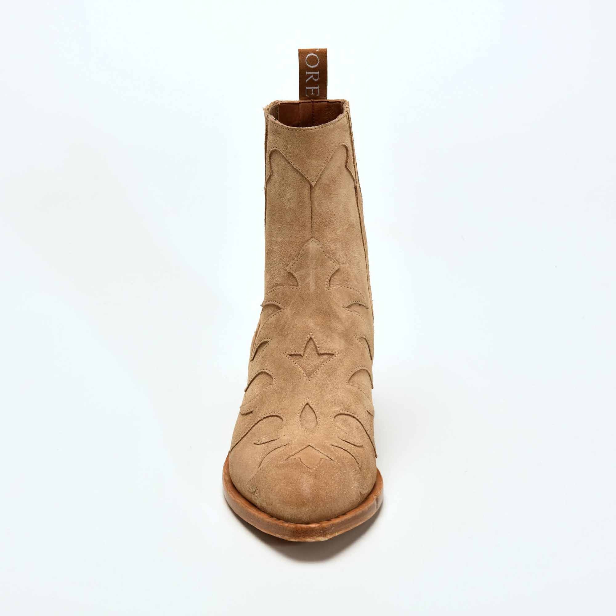 Boots western flamme SR 3645 Sartore iconique en veau velours beige. Ces jolis contrastes sont accompagnés de découpes flamme. Le talon biseauté de 4,5 cm et ses élastiques latéraux assurent un véritable confort