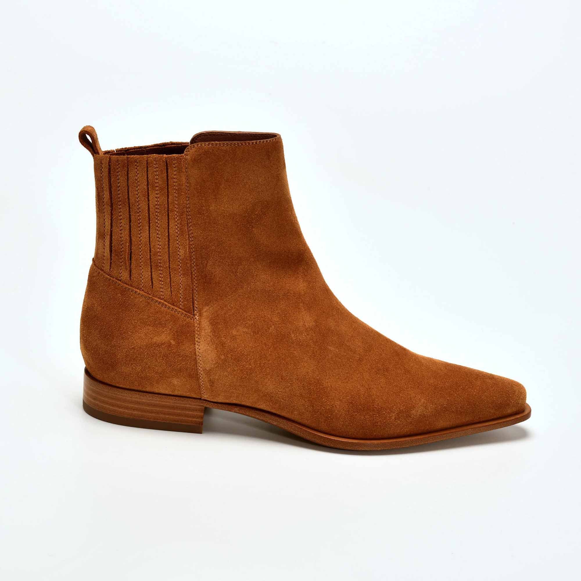 La Nouvelle bottine pointue SARTORE est en nubbuck d'un joli colori GOLD profond. Le talon DROIT de 2 cm et ses élastiques latéraux assurent un véritable confort.