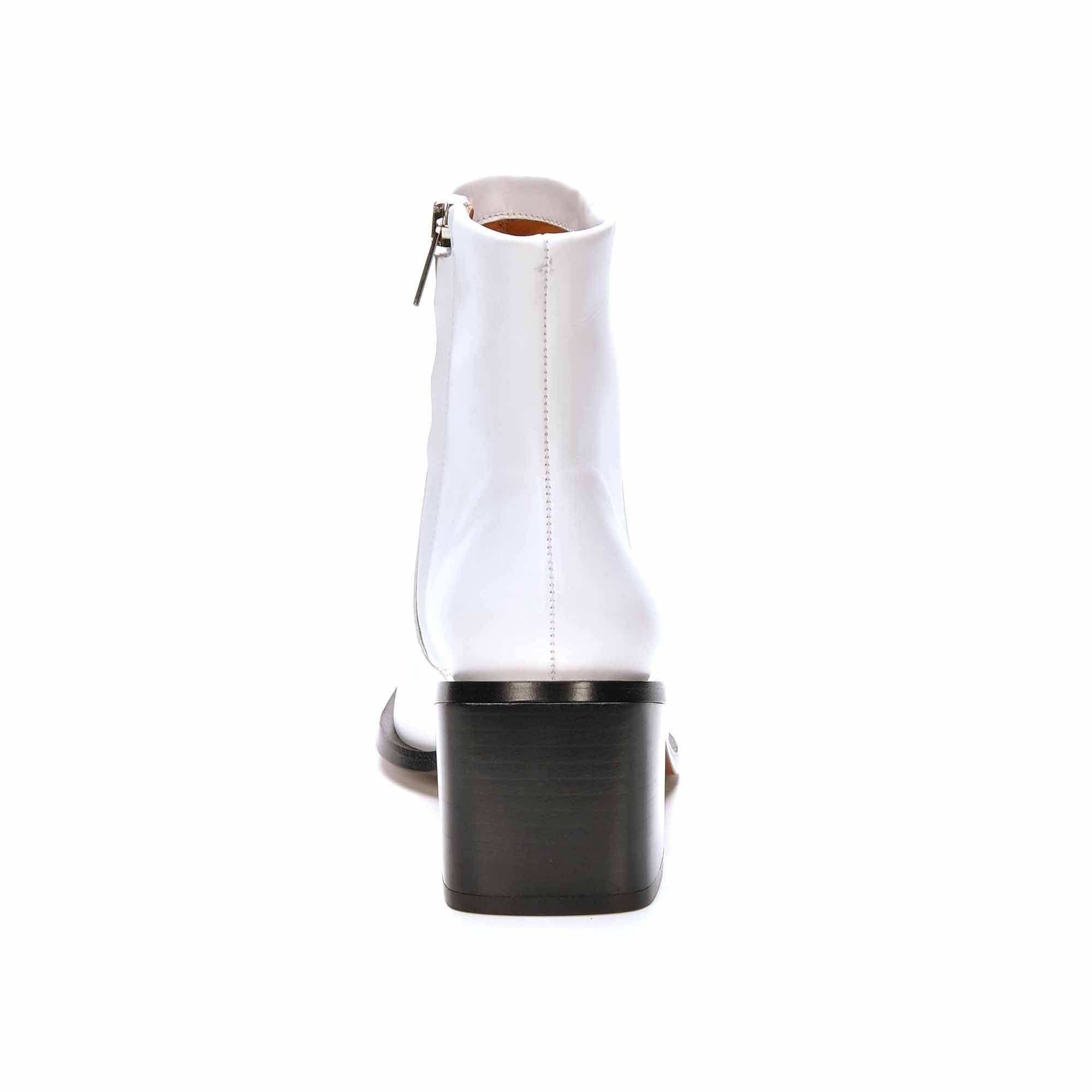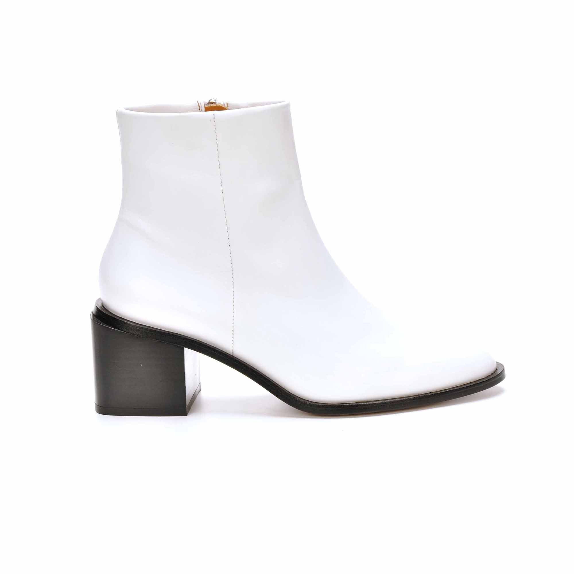 Clergerie vous présente pour l'Hiver 2019/20 la bottine XENIA blanche en cuir de veau . Le talon graphique en lamellé noir donne un confort exceptionnel.