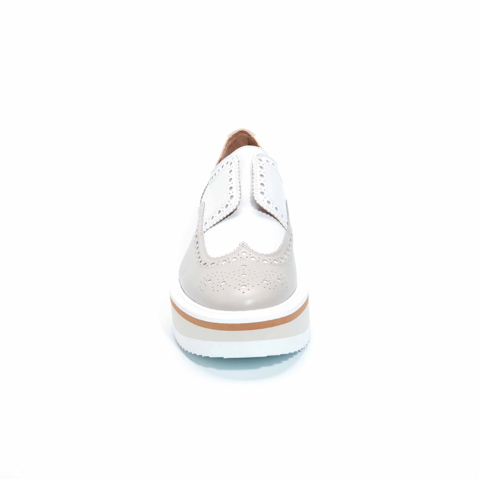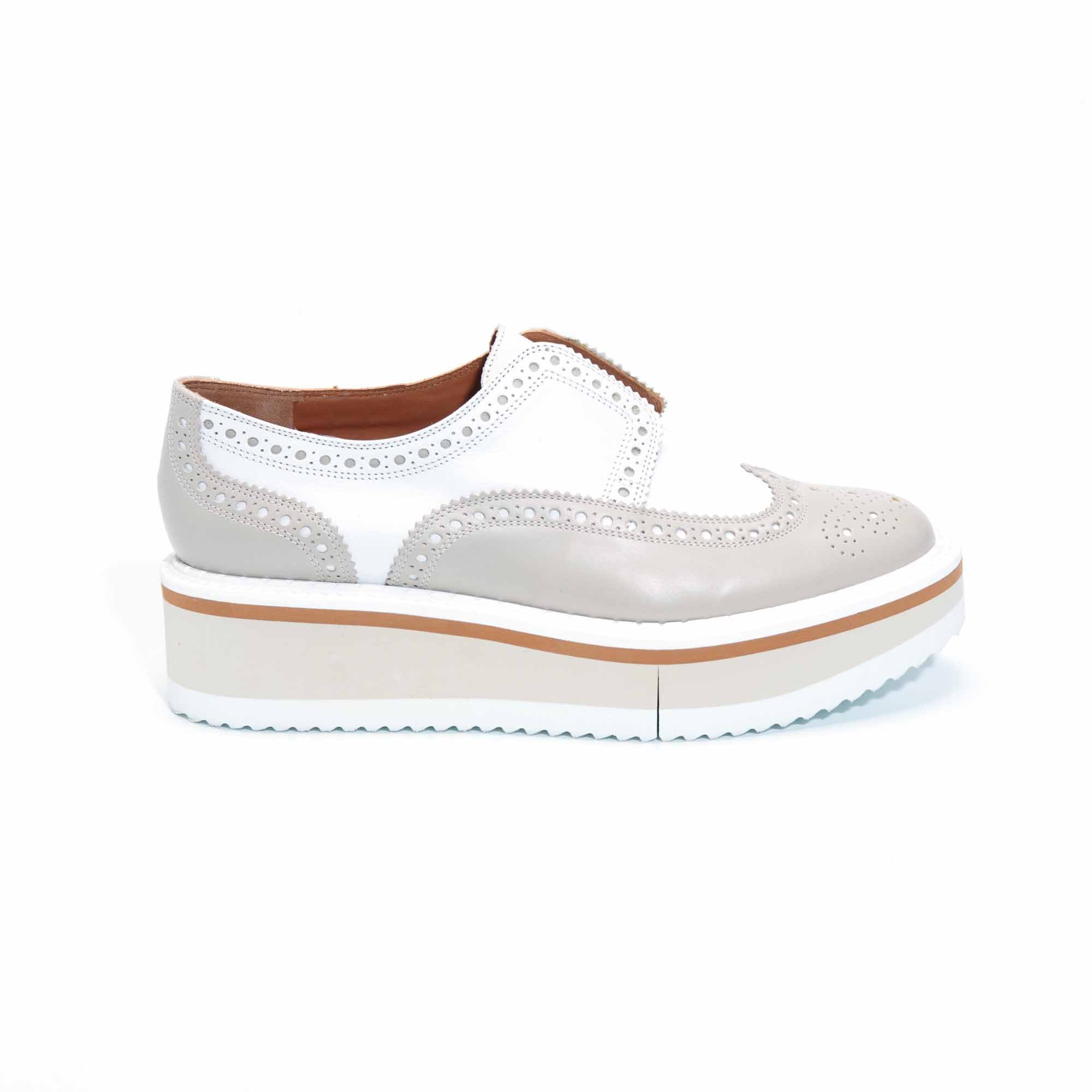Clergerie vous présente le BECKA bout fleuri sans lacet, en cuir argile et blanc . La plateforme articulée bicolore ultra-légère donne un confort exceptionnel.