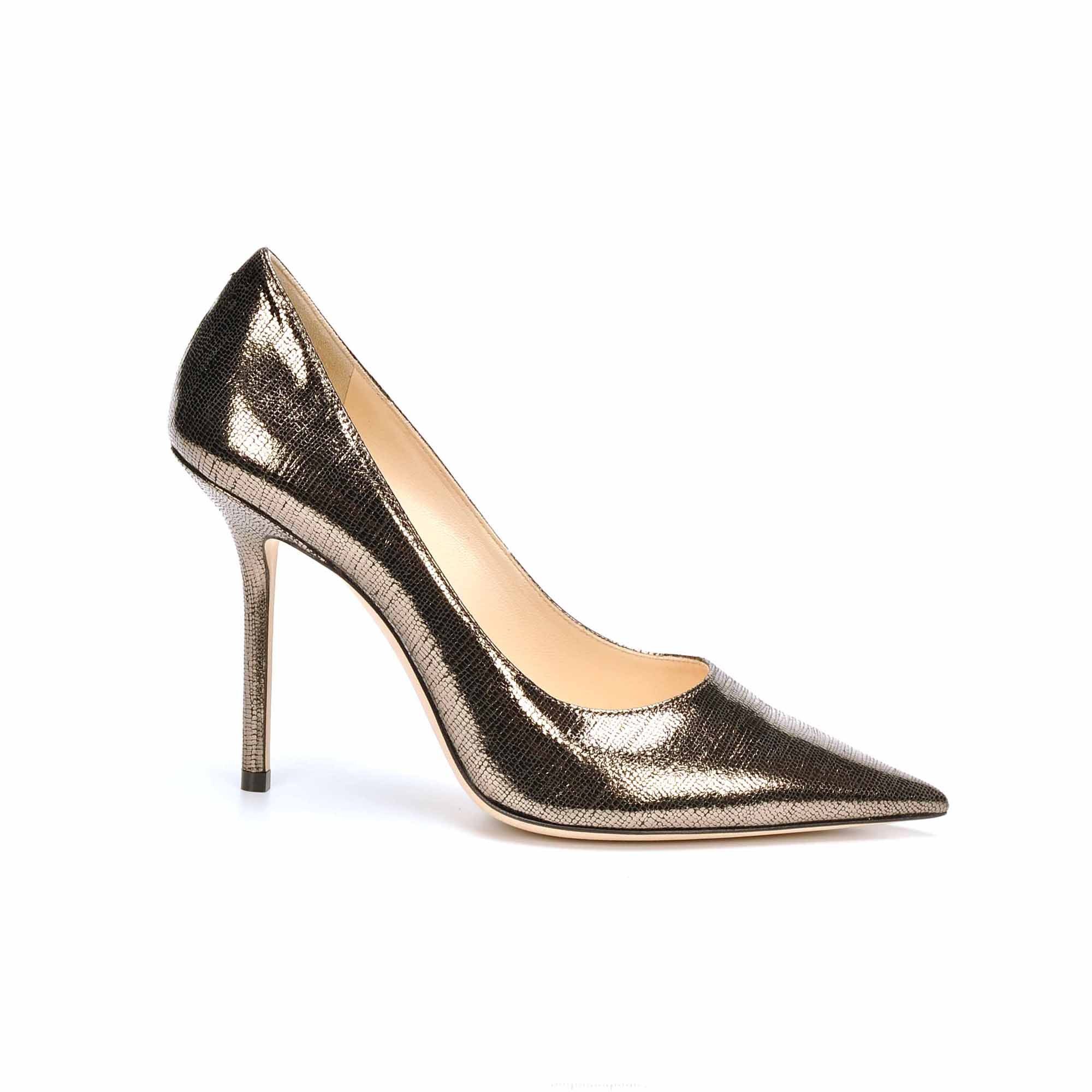 L'escarpin LOVE de chez Jimmy Choo est le nouveau modèle à bout pointu. Le cuir imprimé lézard métallisé anthracite donne du caractère et de l'elegance .Le talon est de 100mn
