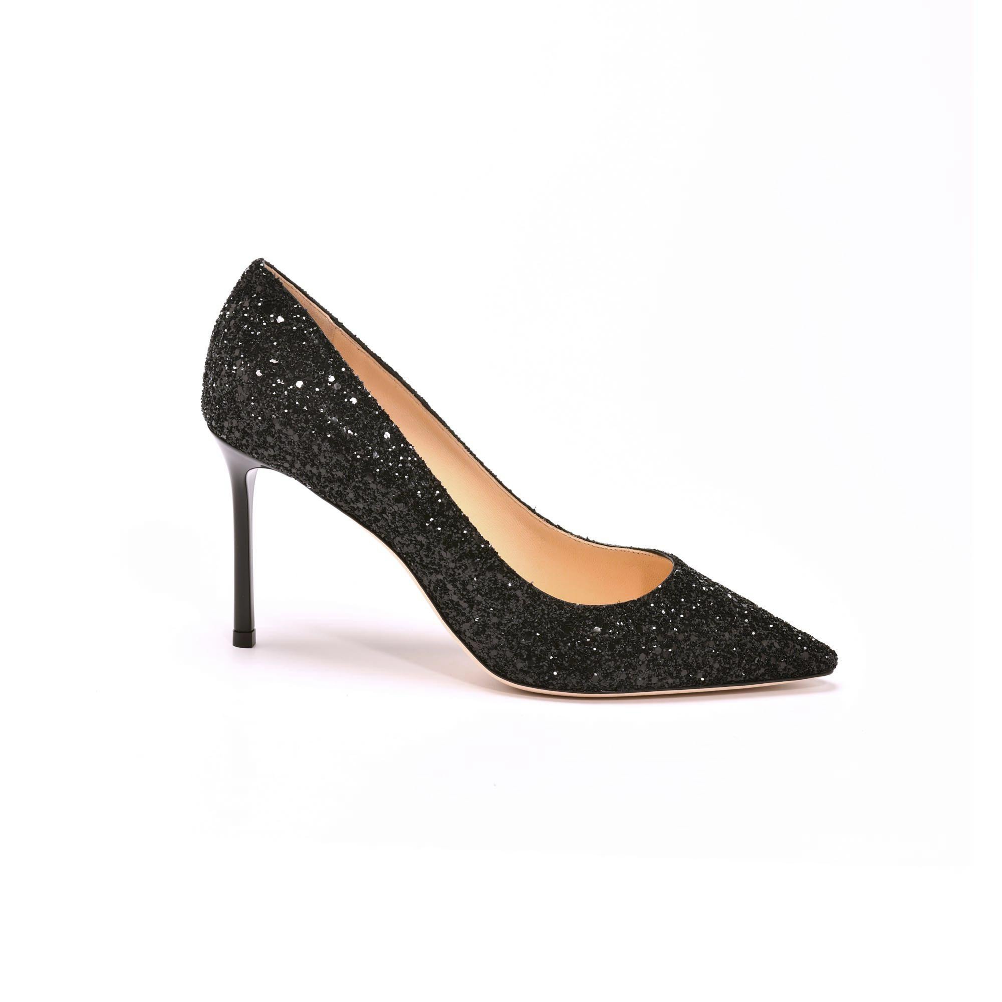 Les escarpins Romy glitter en cuir noir sont la revisite des traditionnels escarpins Romy de Jimmy Choo. L'étoffe à paillettes scintillante noir en est un sublime allié pour un style glamour. Le talon de 85 mm offre une cambrure sublime et glamour