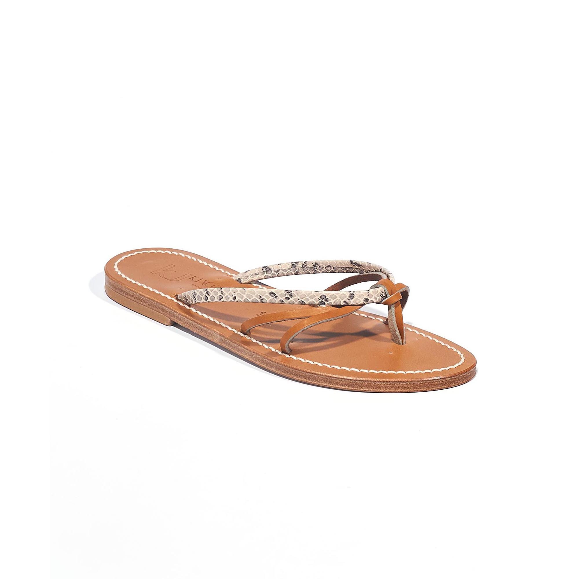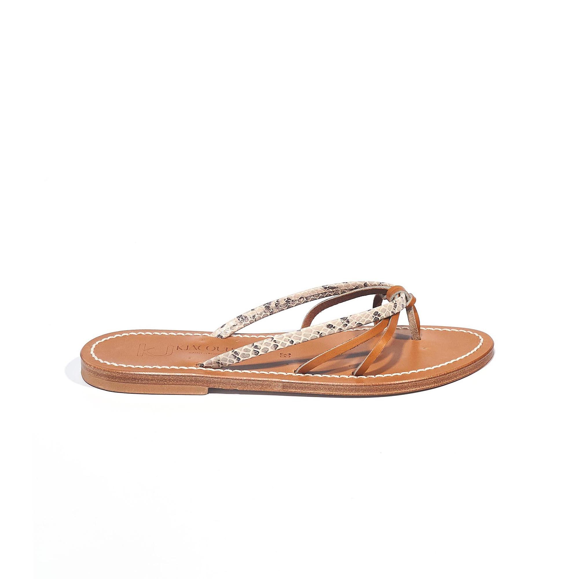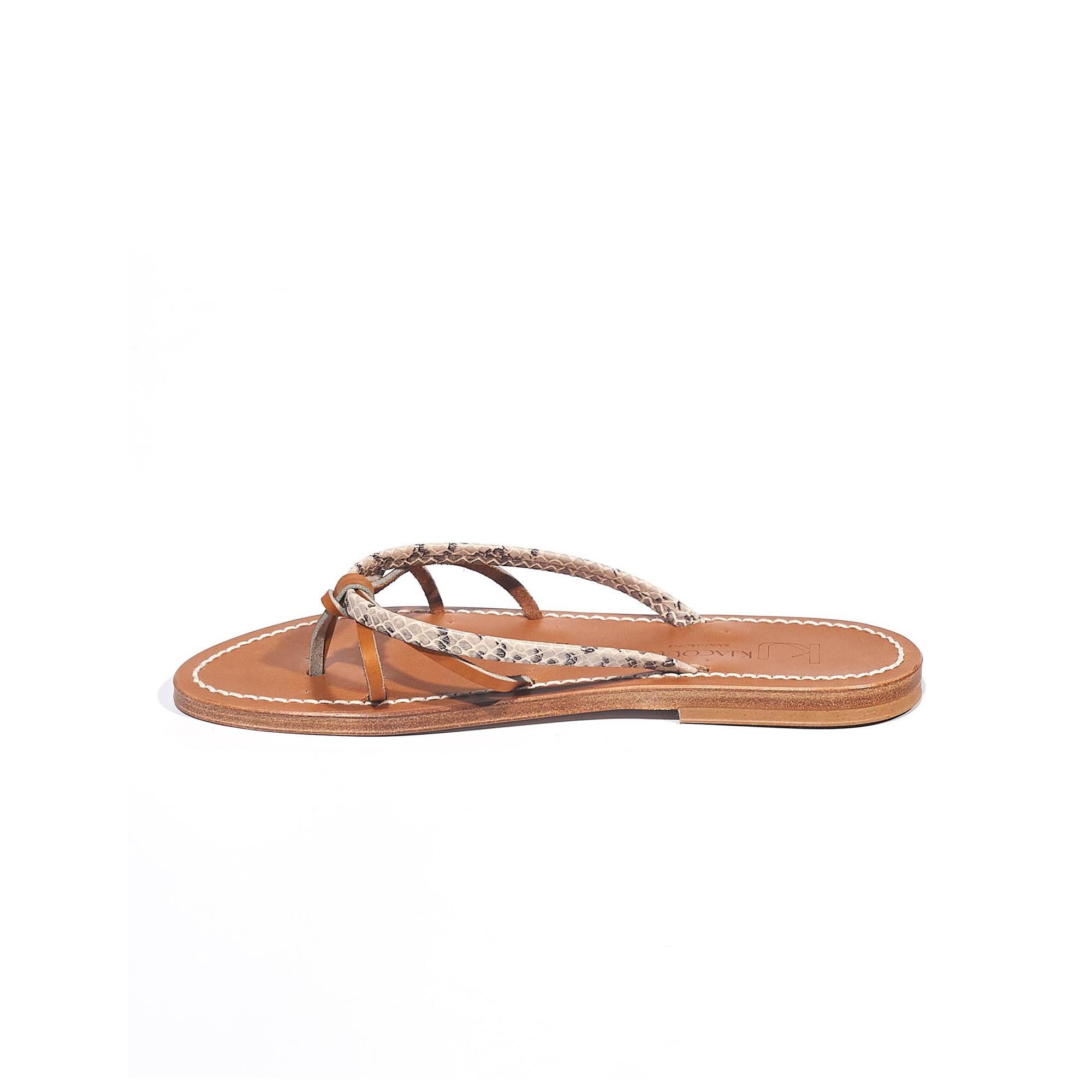 Icone de chez K.Jacques, ces mules en cuir façon naturel aevc détail serpent se marient avec toutes vos tenues d'été. La semelle en cuir et le talon en caoutchouc naturel seront adaptés à toute sorte de promenade.