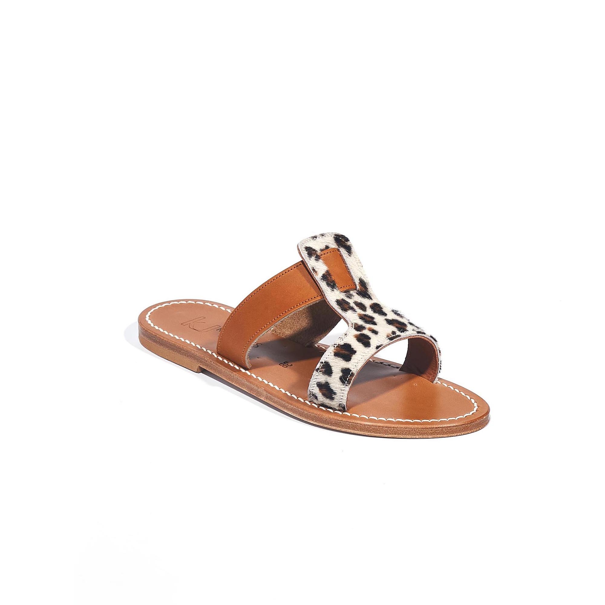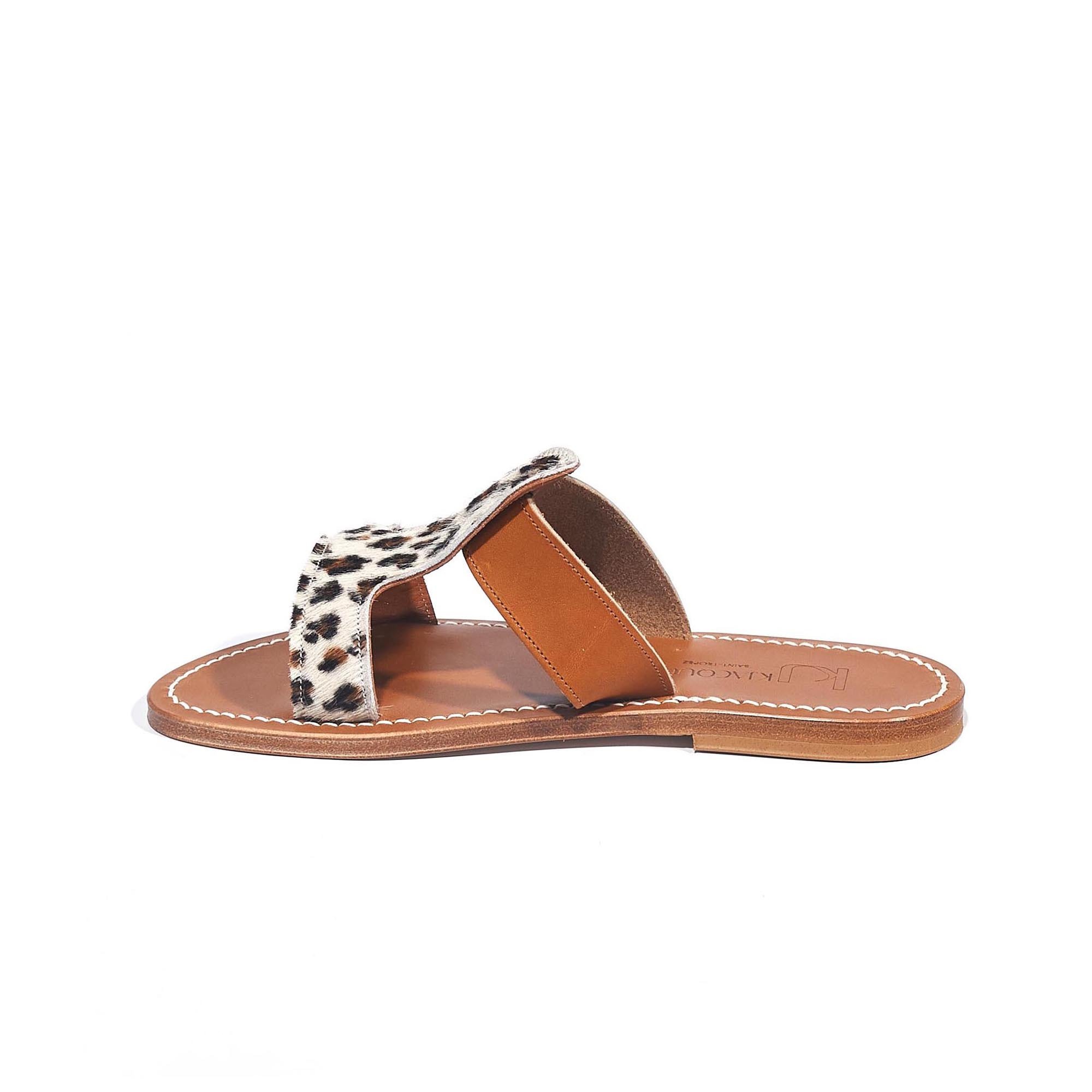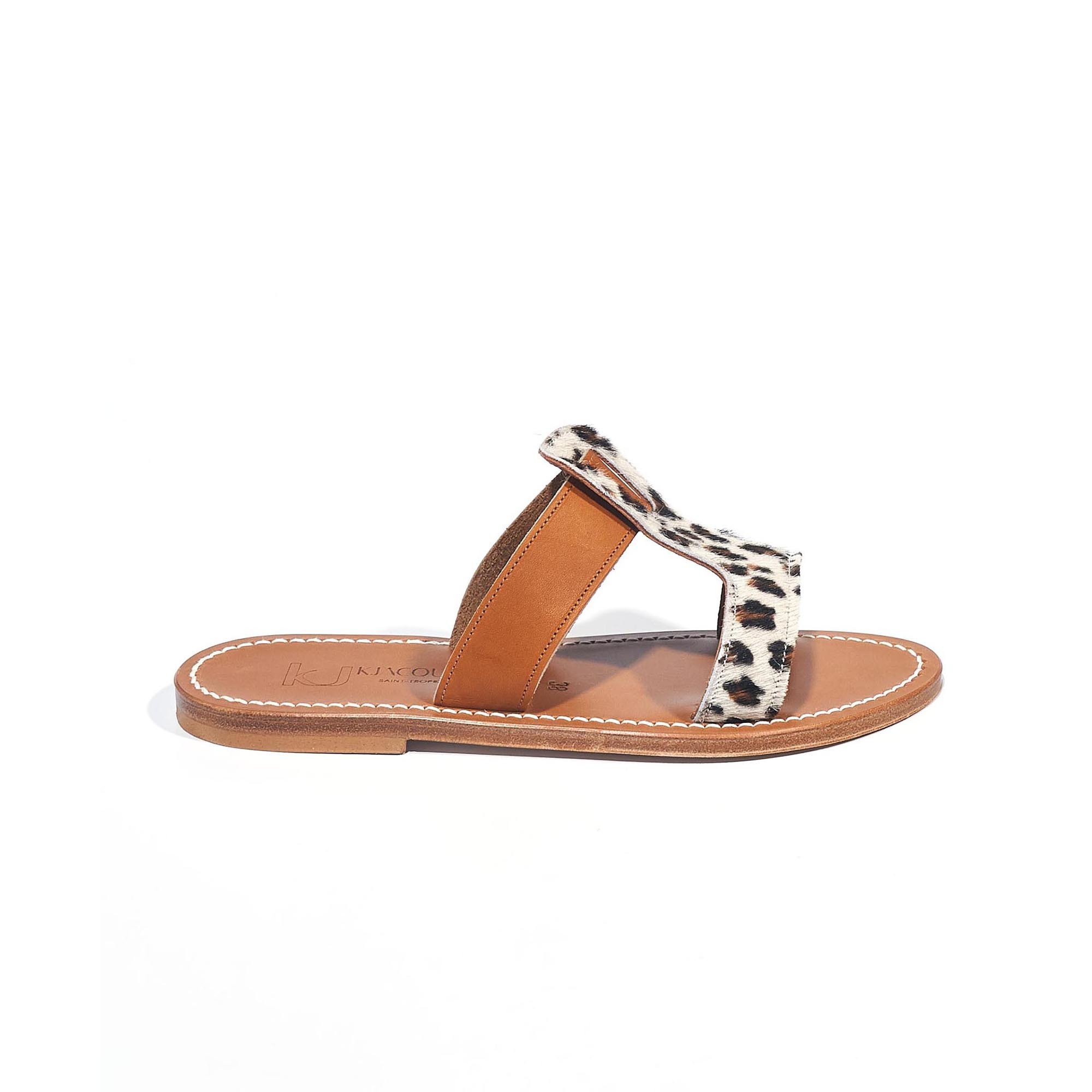 Nouveauté de chez K.Jacques, ces mules en cuir façon léopard se marient avec toutes vos tenues d'été. La semelle en cuir et le talon en caoutchouc naturel seront adaptés à toute sorte de promenade.