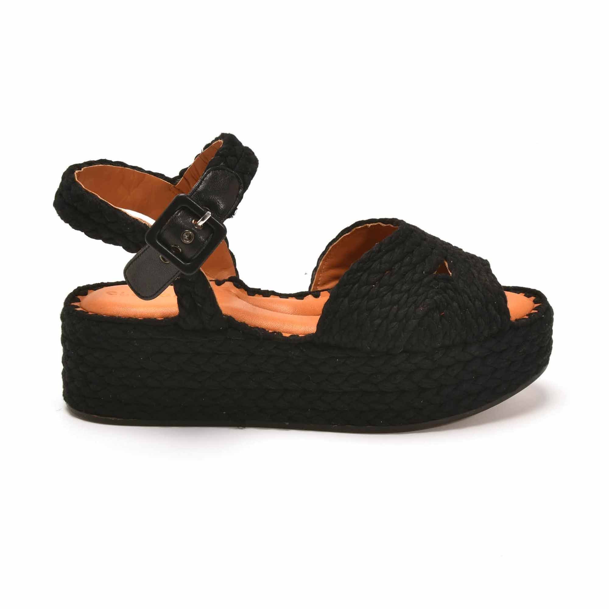 Portez tout l'été les sandales ALDA Clergerie. Elles sont en COTON NOIR. Ces chaussures tressées à la main, avec leur talon compensé et leur fermeture par boucle autour de la cheville sont à porter avec un short ou une jupe en jean. Style décontracté urbain.