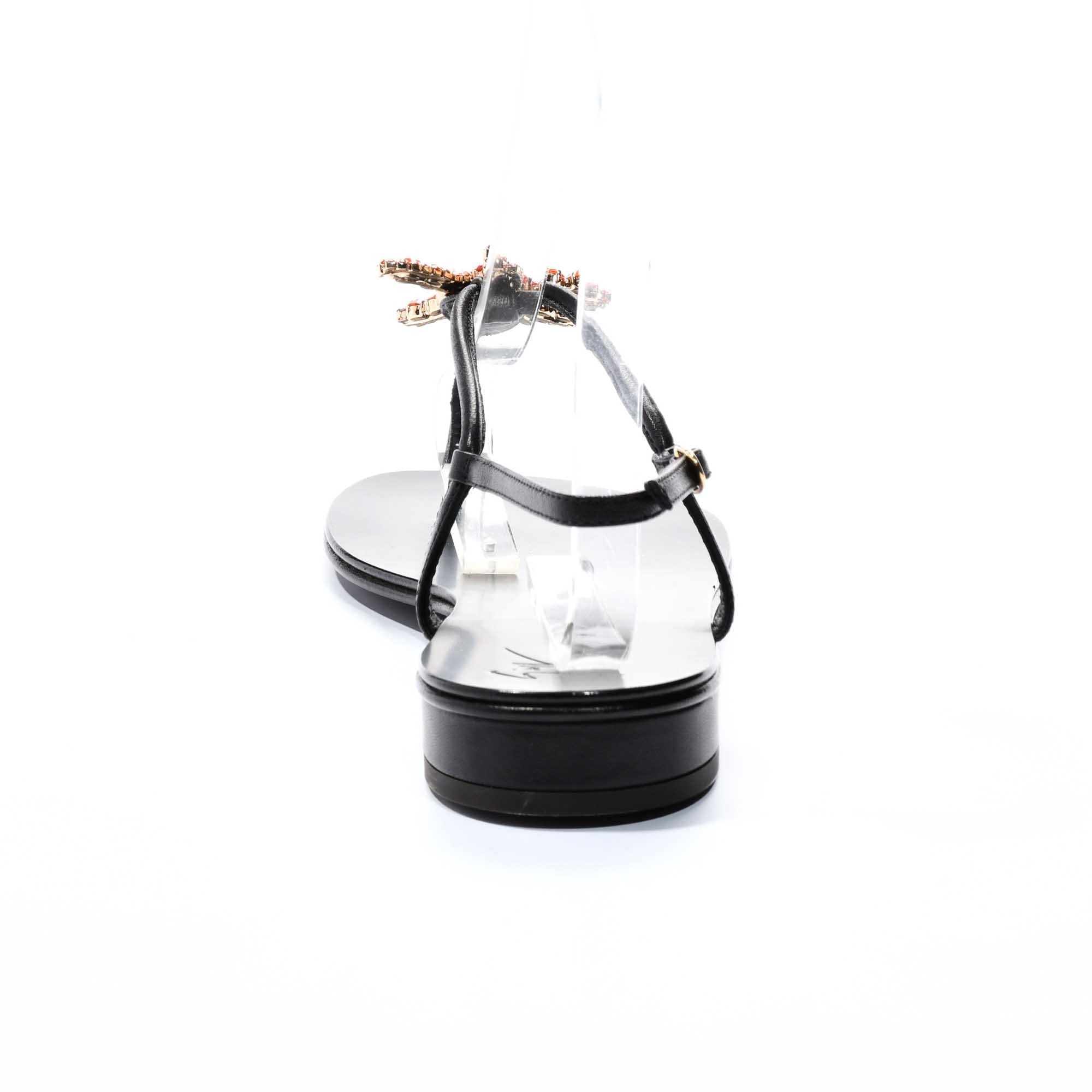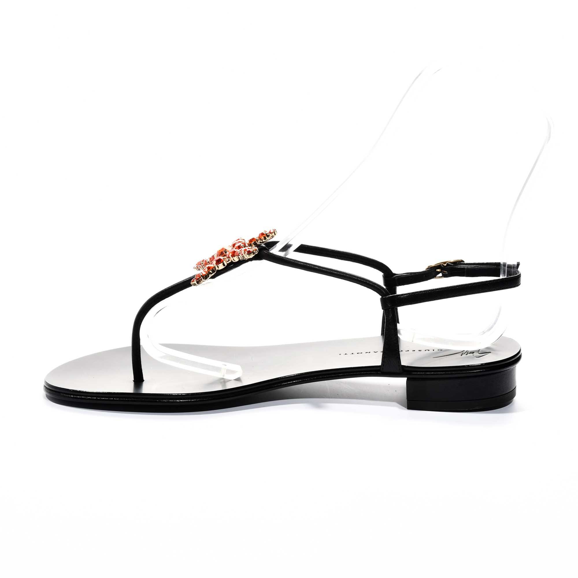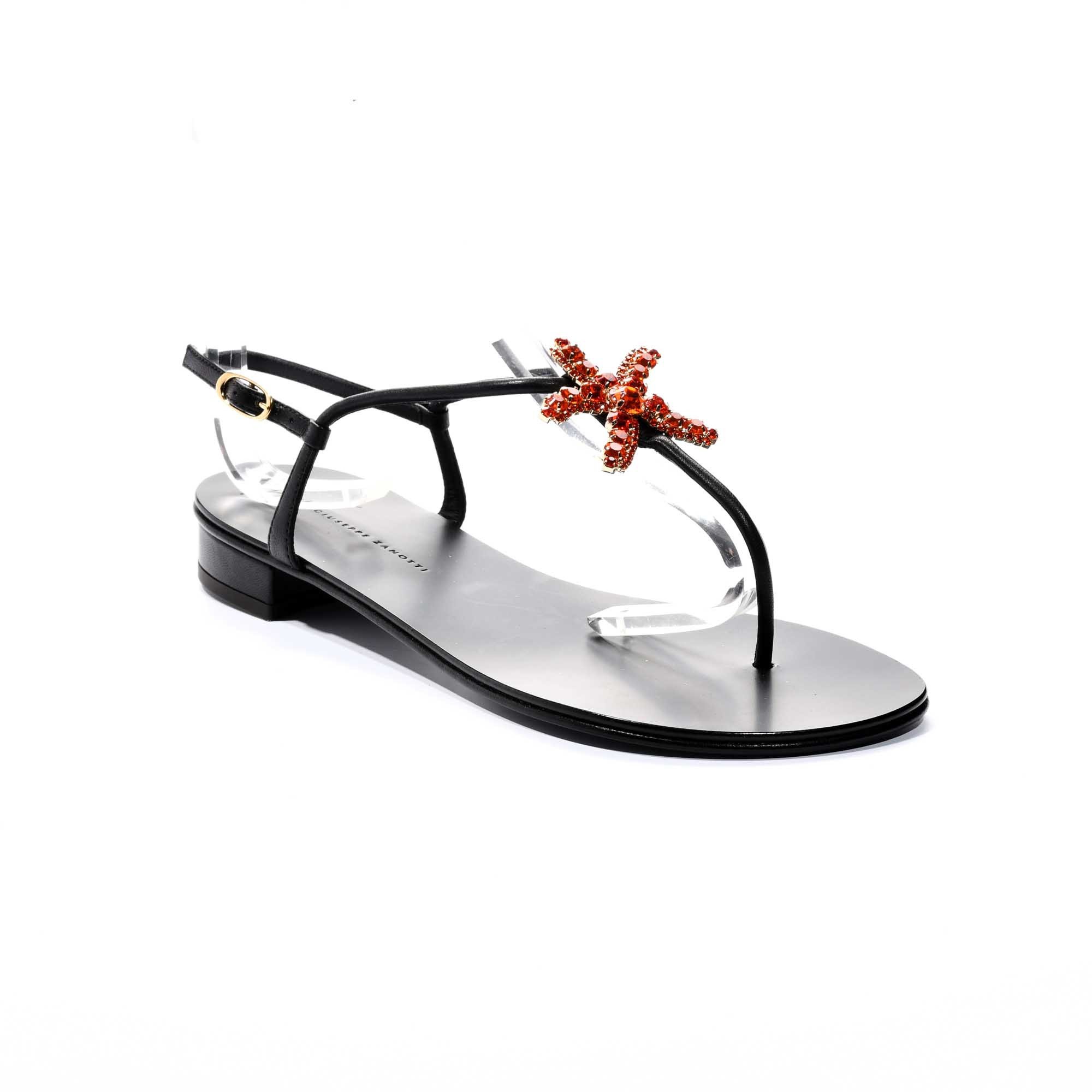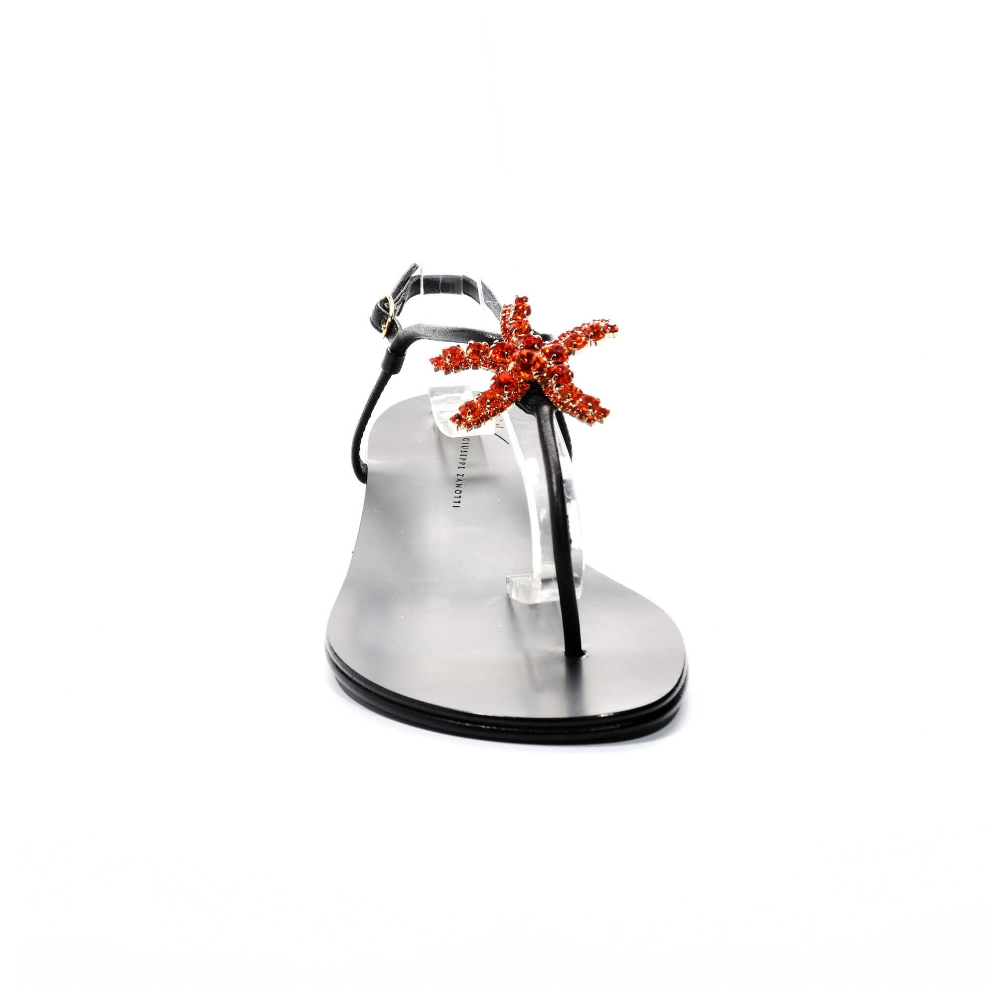 Sandale cuir de veau noir Bughi Giuseppe Zanotti avec bijou orange sur le dessus du pied. Un design en finesse avec des fines brides qui se rejoignent au milieu où est posé le bijou "étoile". Fermeture par boucle dorée et petite hauteur de talon de 2 cm.