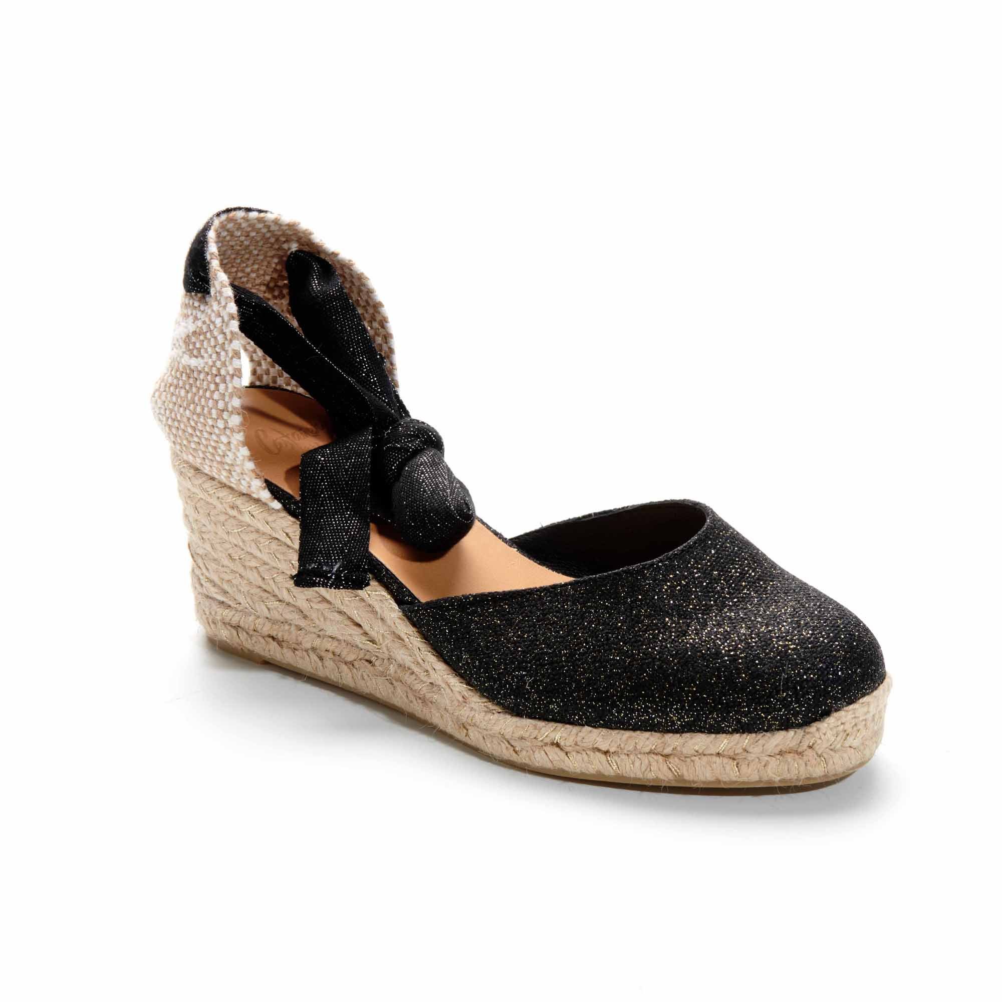Sandale Carina Castaner NOIR LUREX OR Cette sandale en toile se noue à la cheville. Talon en raphia tressé. Hauteur : 6.5 cm, avec plateau d'une hauteur de 1,5 cm.