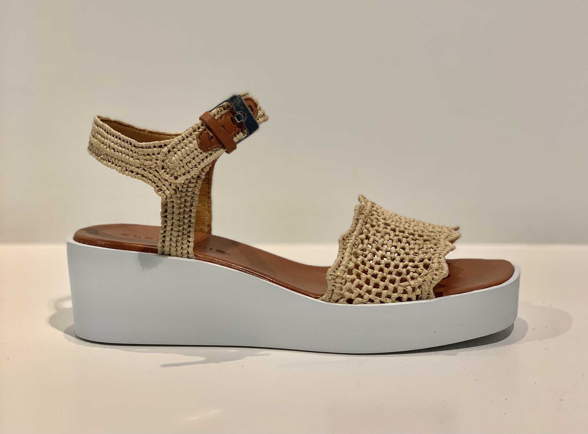 Portez tout l'été les sandales SALLY Clergerie. Elles sont en raphia naturel Ces chaussures tressées à la main, avec leur plateforme compensée blanche et leur fermeture par boucle autour de la cheville sont à porter avec un short ou une jupe en jean. Style décontracté urbain.