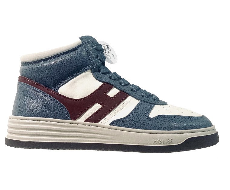 Venez découvrir la toute nouvelle Hogan H630 High Top, elles s'inspirent de vibration rétro. Des sneakers montantes qui fusionnent harmonieusement des éléments à l'univers du basketball tout en glissant les signes distinctifs et emblématiques de la maison Hogan. Son empeigne en cuir lisse bleu et blanc se démarque par le logo H allongé de couleur bordeaux. Sans aucun doute un incontournable du dressing contemporain, ce modèle dynamique est rehaussé d'une semelle en mousse à mémoire de forme ainsi que d’une semelle, conçue en EVA extra-light pour garantir flexibilité, confort et amorti à chaque pas.