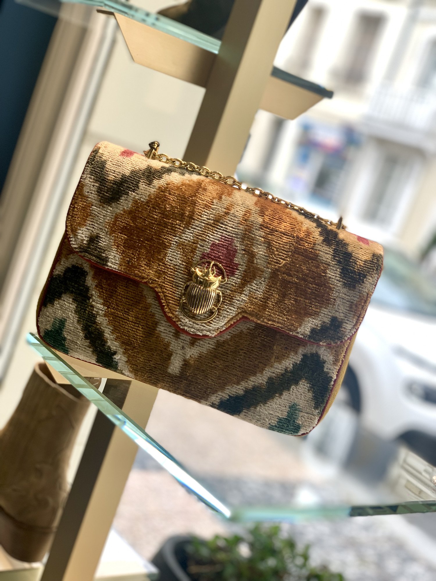 Retrouvez le AVA version BIG en velours de soie multicolore. Il est doté d'une chaîne qui peut se porter simple ou double en fonction de vos envies, il est aussi orné d’un scarabée porte bonheur doré qui lui donne un look chic et rock.