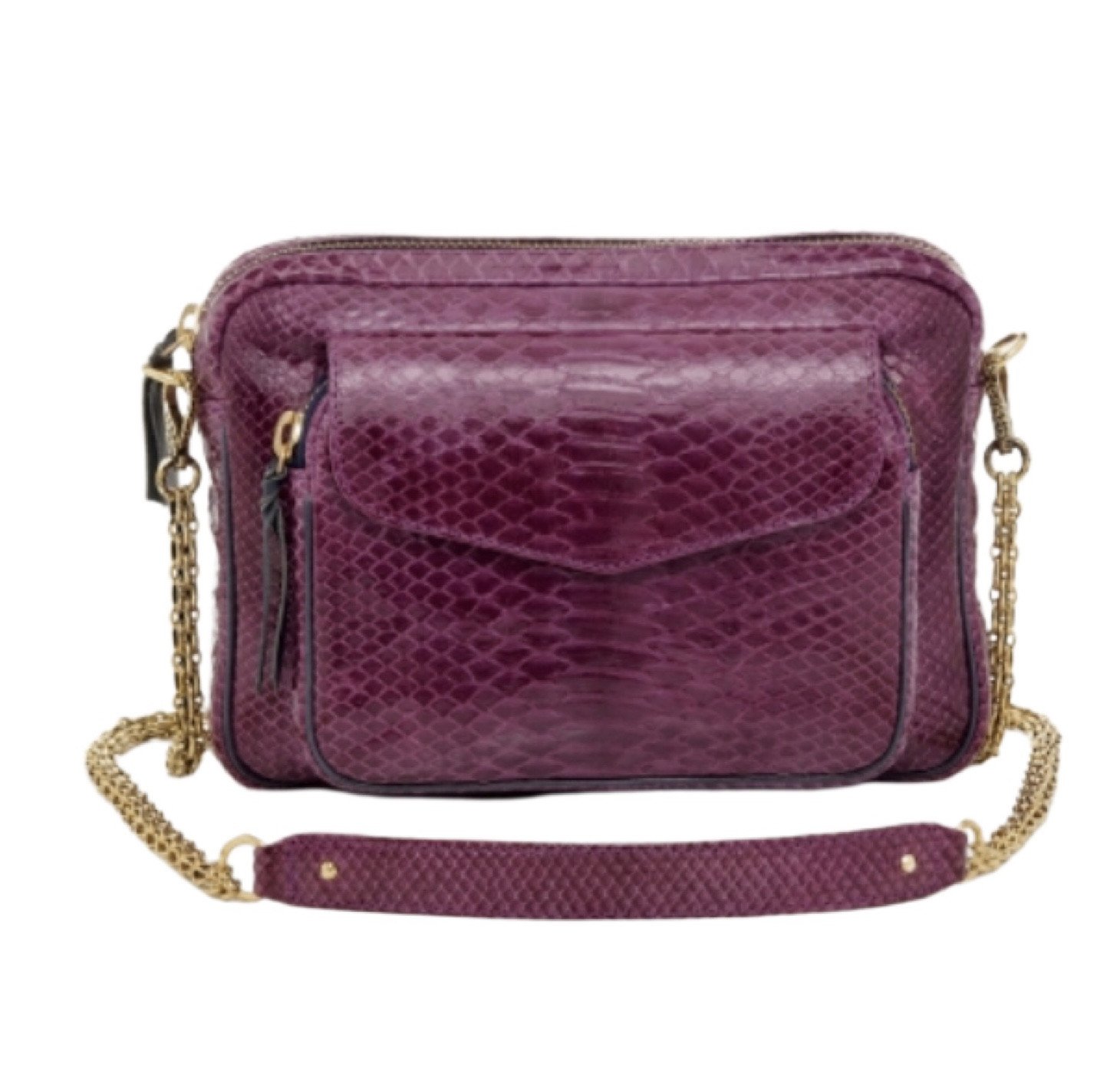 Ce sac porté épaule en python colori violet détails bleu est muni d’une très belle chaîne amovible DOREE avec crochets qui lui donne un look tendance.
