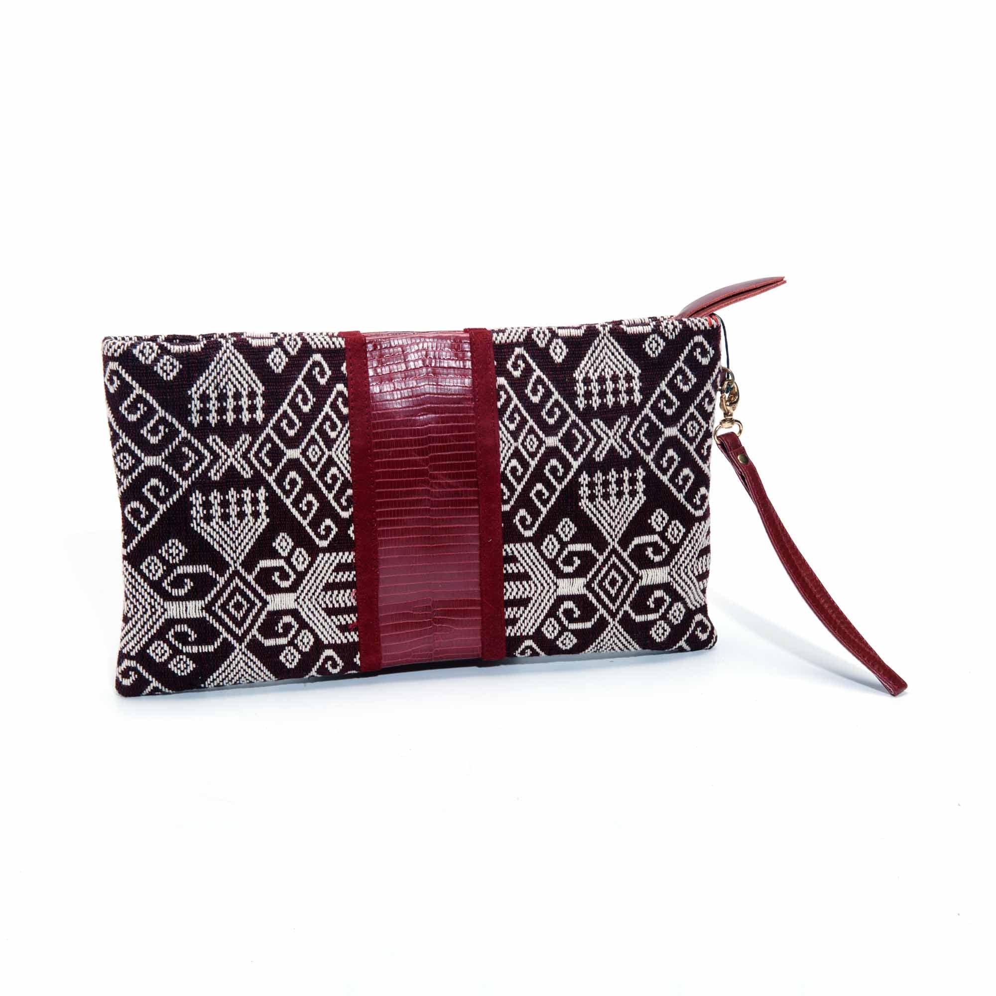 Cette pochette en tissus timor et lezard bordeaux est dotée d’une dragonne en cuir qui permet de la porter facilement à la main ou peut se glisser facilement dans un sac