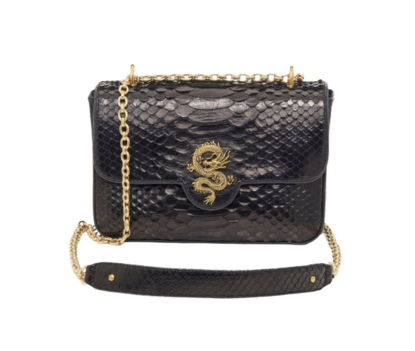 Retrouvez le AVA version MEDIUM en python NOIR. Il est doté d'une chaîne dorée qui peut se porter simple ou double en fonction de vos envies, il est aussi orné d’un dragon doré qui lui donne un look chic et rock.