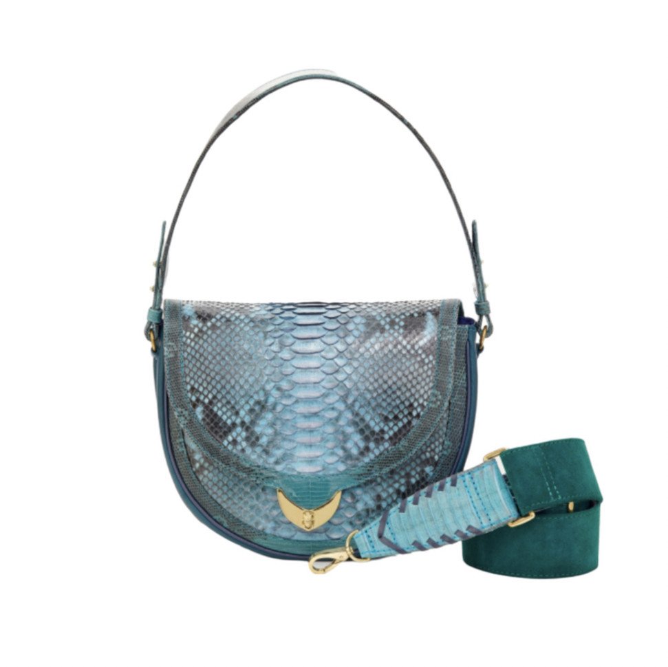 Ce magnifique sac est confectionné en python et veau velours COLORI LAGON. Deux façons de porter ce sac, avec une anse à l'épaule ou bien avec une magnifique bandoulière verte et turquoise. Une jolie métallerie dorée ornée du baby scarabée ferme le sac VICTORIA.